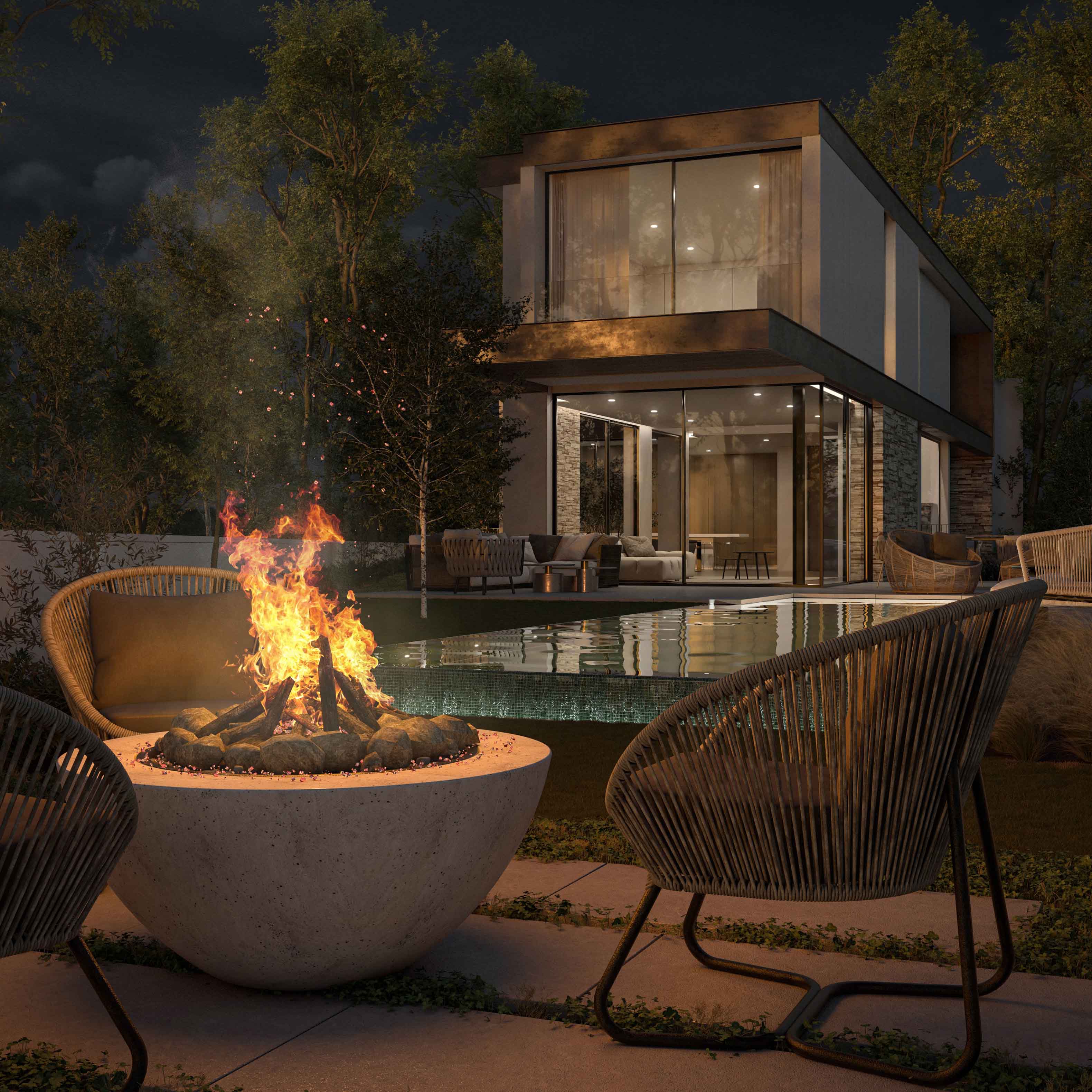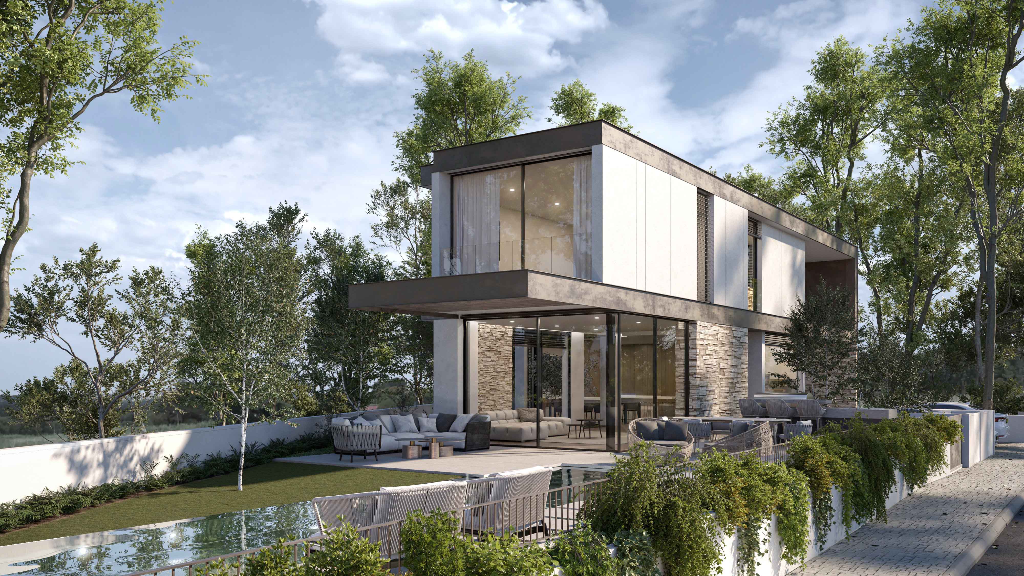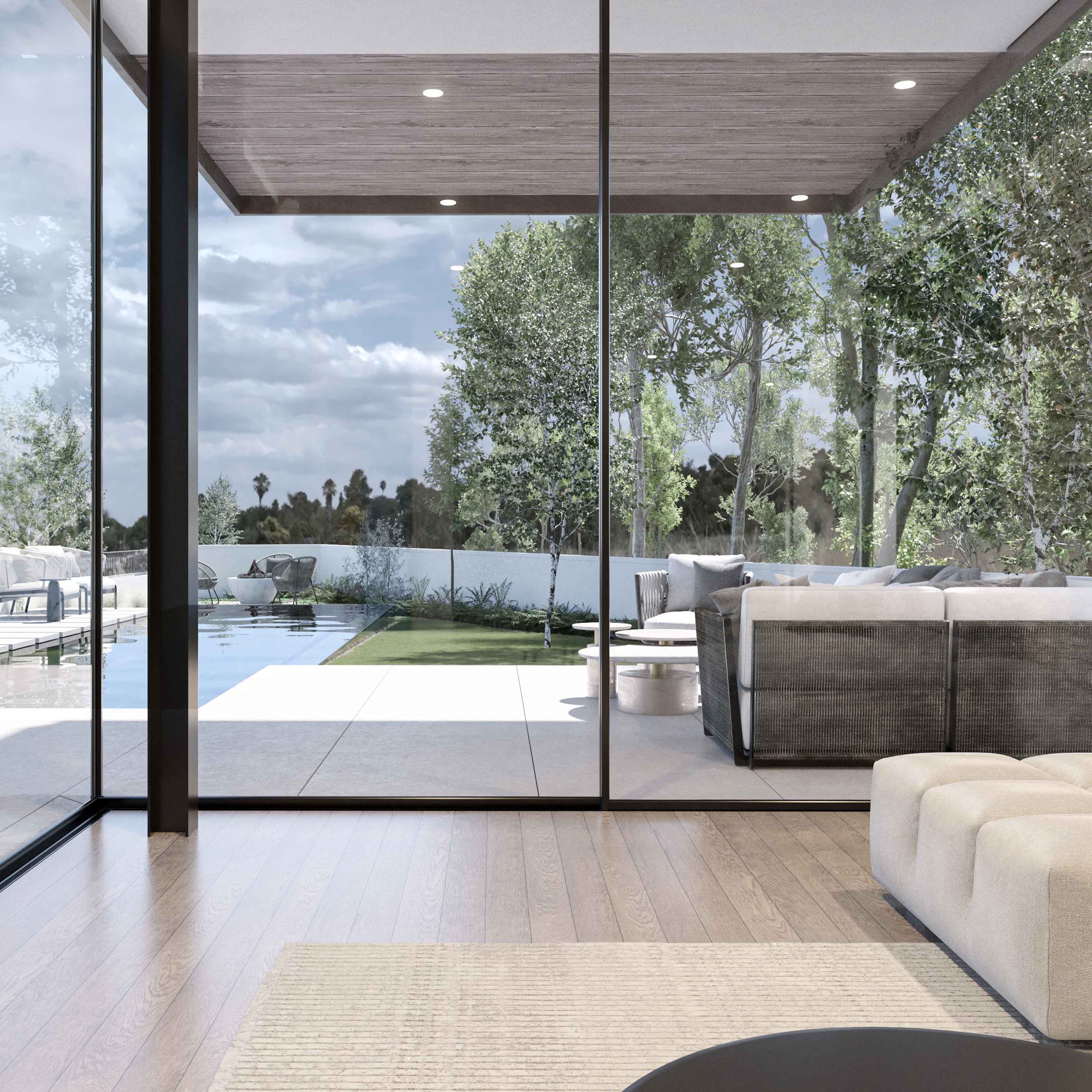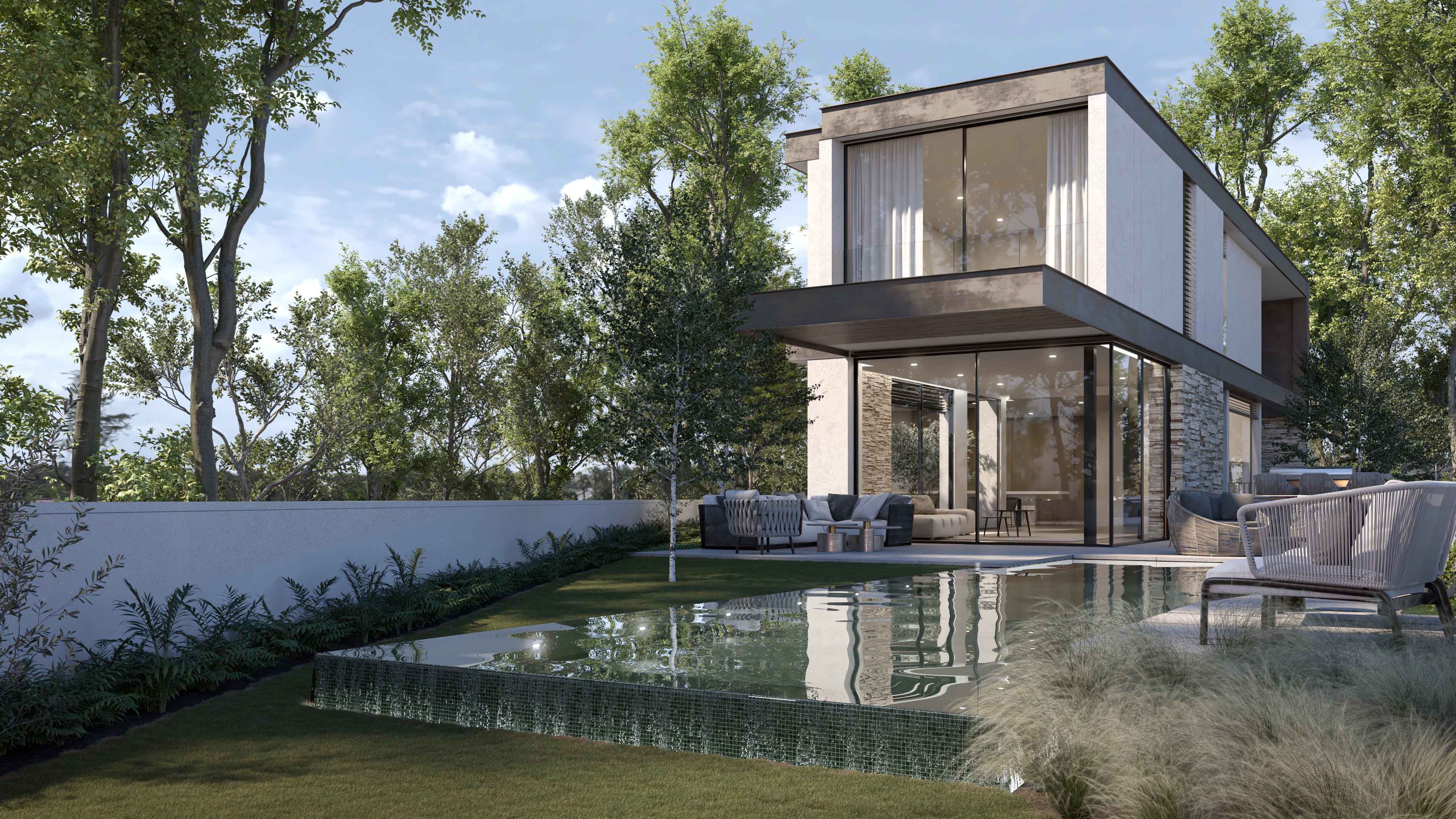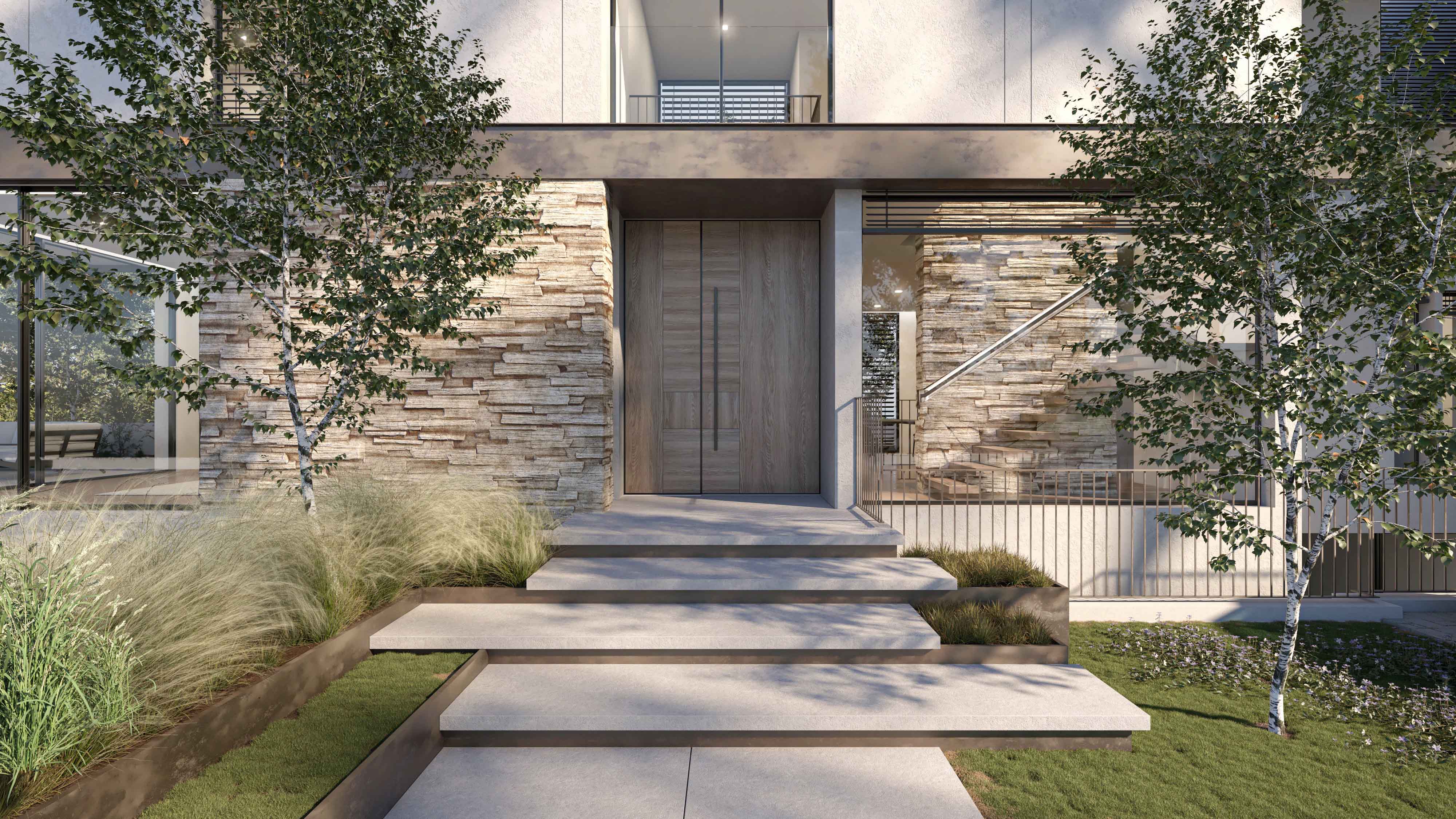 פרטי בניה מורכבים מאפשרים חלונות מרצפה-לתקרה ומראה נקי ומינימליסטי.
