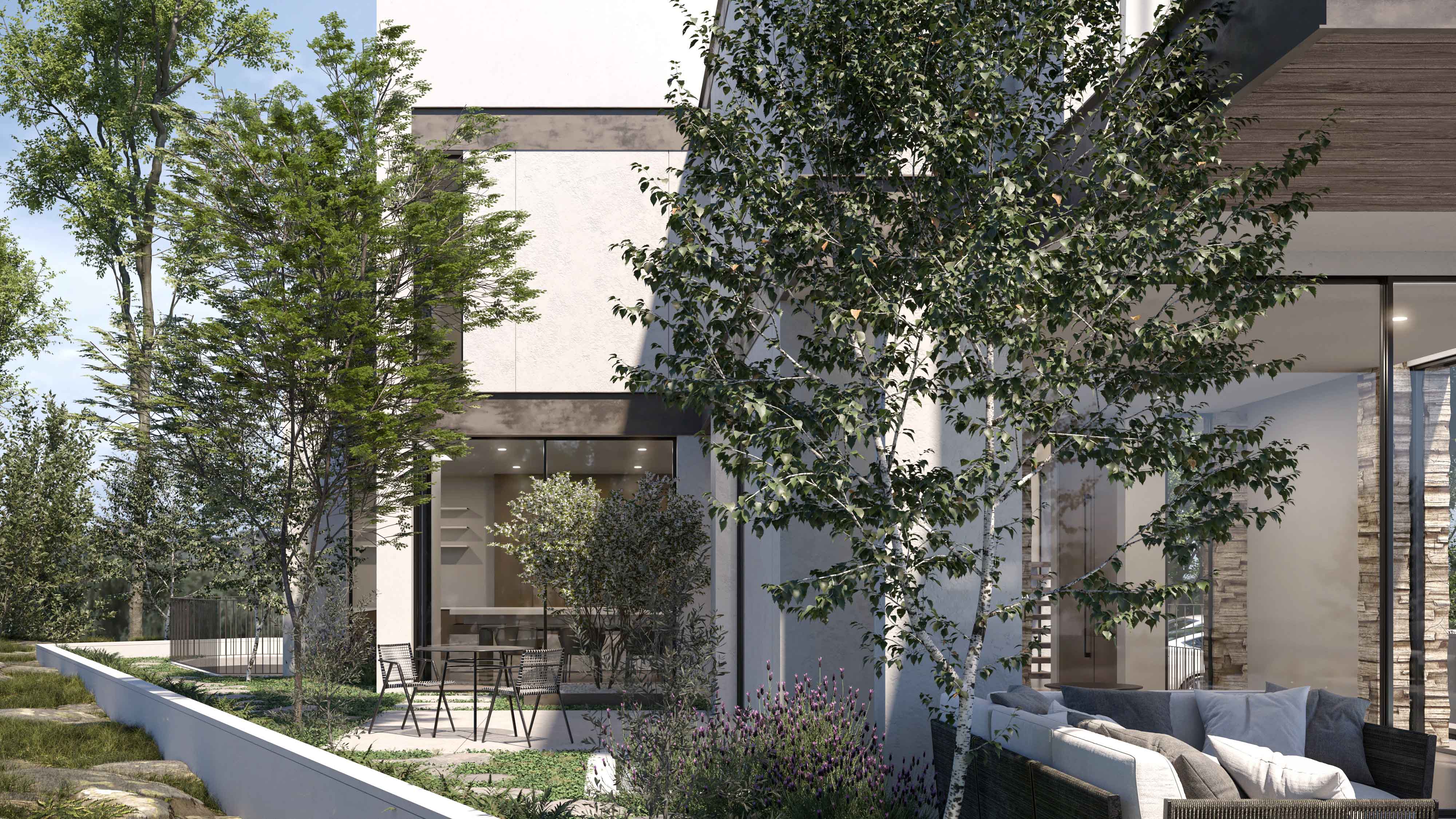 תכנון אדריכלי ועיצוב פנים עבור בית חדש, עם קיר משותף, בסגנון מודרני, בשכונה ותיקה ושקטה באבן יהודה.
